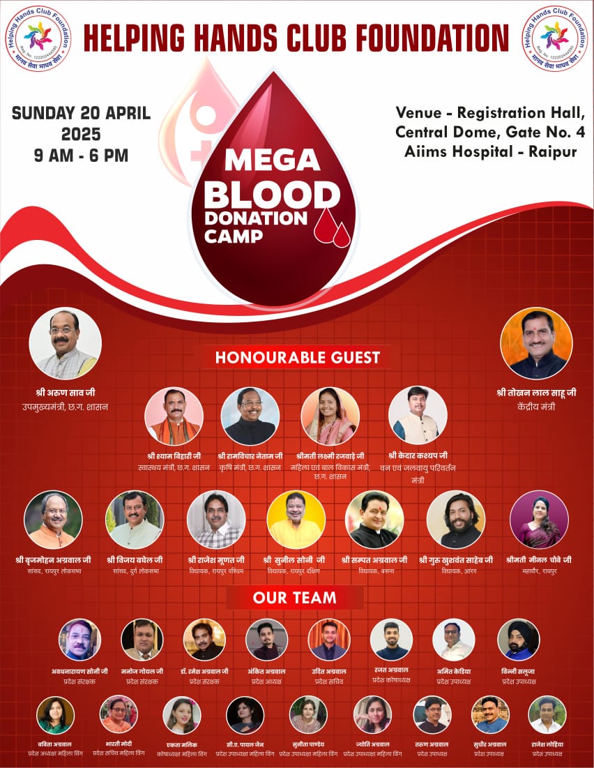 रायपुर (न्यूज उड़ान) मानवसेवा माधवसेवा के संकल्प के साथ छत्तीसगढ़ सहित देश के अन्य राज्यों में भी स्वास्थ संबंधित और पर्यावरण संरक्षण, शिक्षा के छेत्र में सामाजिक कार्य करने वाली सामाजिक संस्था हेल्पिंग हैंड्स क्लब फाउंडेशन द्वारा 20 अप्रैल दिन रविवार को राजधानी रायपुर के एम्स हॉस्पिटल में रक्तदान का महाकुंभ शिविर लगाया जा रहा है। यह रक्त दूर दराज से ग्रामीण अंचल से अनजान शहर आए लोगों को तत्काल राहत पहुंचाएगा। इस महाकुंभ में छत्तीसगढ़ के उप मुख्यमंत्री अरुण साव , केंद्रीय राज्य मंत्री तोखन साहू, वन मंत्री केदार कश्यप, कृषि मंत्री रामविचार नेताम , महिला बाल विकास मंत्री लक्ष्मी राजवाड़े , सांसद बृजमोहन अग्रवाल, सासंद विजय बघेल , विधायक राजेश मूणत, विधायक संपत अग्रवाल, विधायक गुरु खुशवंत साहेब , विधायक सुनील सोनी , रायपुर महापौर मीनल चौबे, समाजसेवी बसंत अग्रवाल, सुनील रामदास अग्रवाल, संजय अग्रवाल NR, अनूप बंसल , अशोक सियाराम अग्रवाल, राजेश अग्रवाल , वीरेंद्र सिंह तोमर सहित अनेकों मंत्री नेतागण , अधिकारीगण समाजसेवियों का आगमन होने जा रहा है। हेल्पिंग हैंड्स क्लब फाउंडेशन द्वारा जोरो शोरों से तैयारी की जा रही है एवं इनका लक्ष्य है कि प्रदेश में रक्त समय से न मिलने के कारण किसी की भी मृत्यु न हो। हेल्पिंग हैंड्स क्लब फाउंडेशन निरंतर ही बड़े बड़े सामाजिक आयोजन समझ हित में करते नजर आता है। वहीं सभी मंत्रिमंडल ने वीडियो संदेश के माध्यम से जनता से अपील की है इस रक्तदान के महाकुंभ में शामिल होने की। वित्त मंत्री ओपी चौधरी ने भी वीडियो संदेश के माध्यम से जनता से अपील की इस महाकुंभ का हिस्सा बनने की। रक्तदान महादान है जीवनदान है। हेल्पिंग हैंड्स क्लब फाउंडेशन के पदाधिकारी ने सभी राजधानी रायपुर एवं आस पास के सभी लोगों से अपील की है कि इस महाकुंभ में आकर पुनीत कार्य में उनका सहयोग करे।