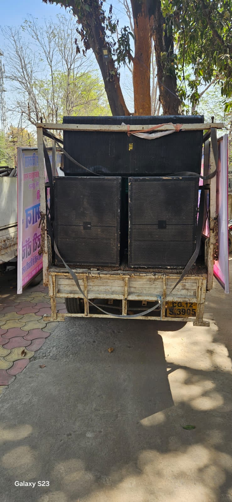 वाहन के पीछे ट्राली में लगा डीजे साउंड सिस्टम