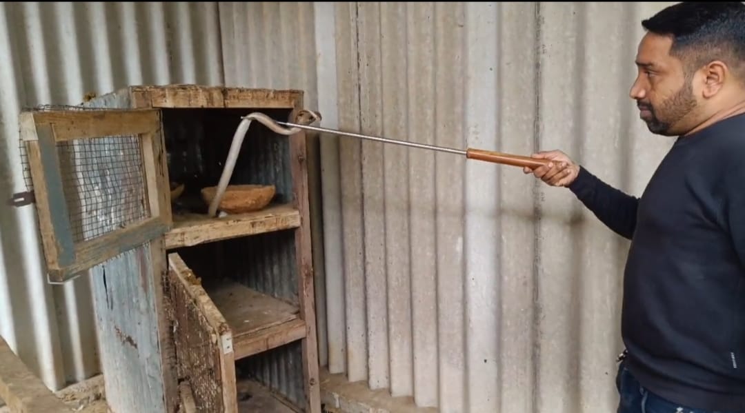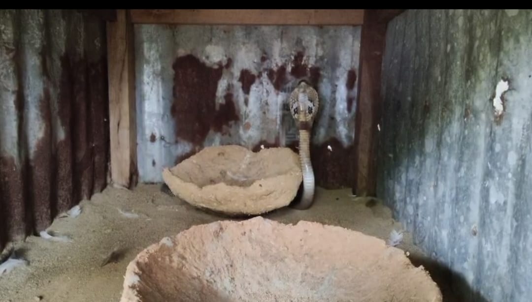 : मुर्गी के बाड़े में घुसा शिकार करने कोबरा, वन विभाग के रेस्क्यु टीम ने किया कोबरा का रेस्क्यु।