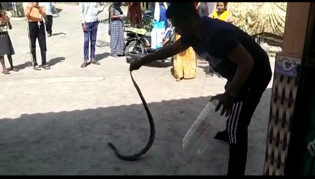 : नाश्ता बनाने गई महिला को किचन में दिखा नाग, बेसिन के किरने बैठा था, वाइल्डलाइफ रेस्क्यू टीम के सदस्यों ने किया रेस्क्यू।