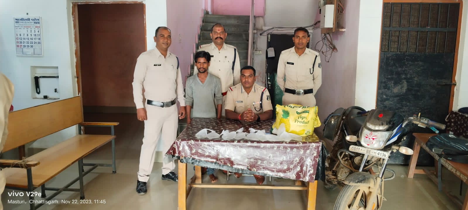दिनांक 21.11.23 को मुखबिर से सूचना मिला कि एक व्यक्ति कोटमी सोनार से जयराम नगर की ओर से मोटर सायकल क्र सीजी 11 बीई 4136 में अवैध रूप से अत्यधिक मात्रा में शराब ले जा रहा है कि सूचना पर थाना मस्तूरी पुलिस द्वारा तत्काल घेरा बंदी कर आरोपी मोहित कुमार केवट पिता डुबास राम केवट उम्र 24 साल दरी भाठापारा कोटमीसोनार थाना अकलतरा जिला जांजगीर चांपा के कब्जे से एक बोरी में 1-1 लीटर क्षमता वाली पन्नी में भरी हुई आधा-आधा लीटर की 30 नग कुल 15 लीटर महुआ शराब कीमती 1800 रू शराब को मोटर सायकल क्र सीजी 11 बीई 4136 से अवैध रूप से शराब परिवहन करते पाये जाने पर उक्त आरोपी के विरूद्ध धारा 34(2) आबकारी एक्ट के तहत कार्यवाही किया गया है।
