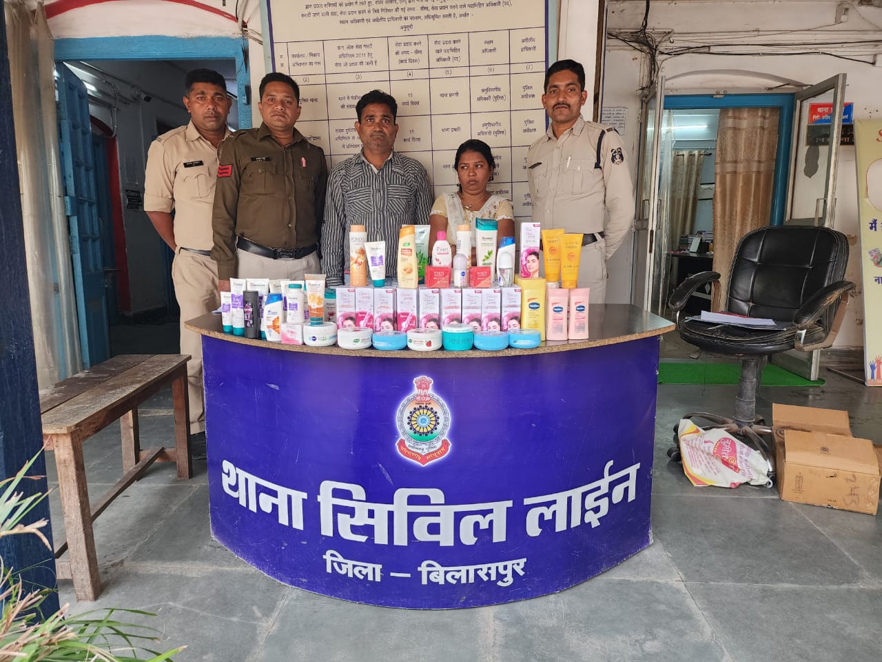 दोनो चोरों के कब्जे से चोरी गई कास्मेटिक समान जैसे - फेयर एंड लवली, शैंपू, फेस क्रीम, बॉडी लोशन इत्यादि समान किया गया गया जप्त।