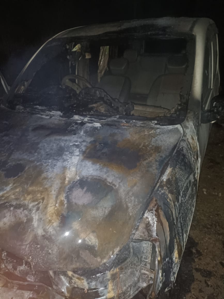 इसी दौरान किसी असामाजिक तत्व ने कार के पिछले हिस्से आग लगा दी कुछ ही देर में आग ने विकराल रूप धारण कर लिया और कार को अपनी चपेट में ले लिया।