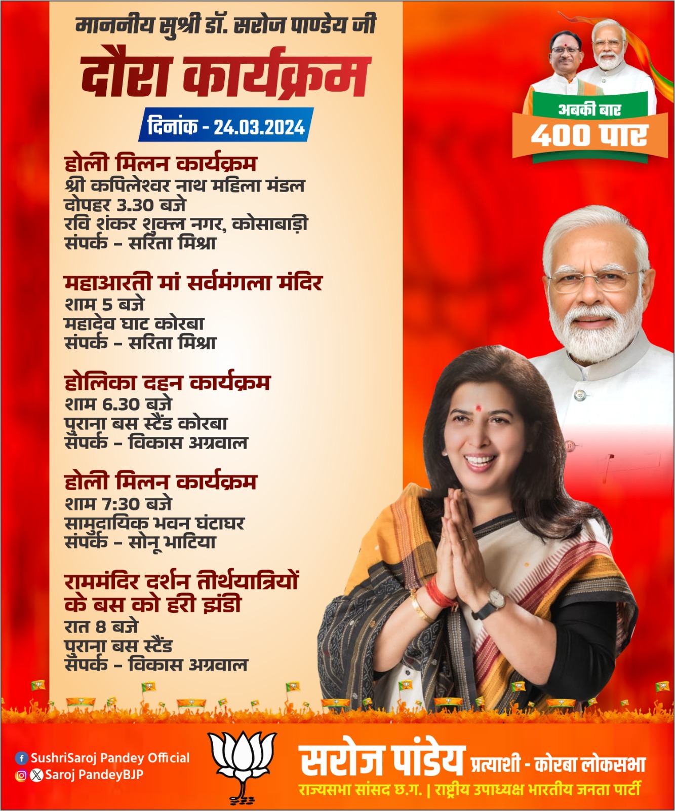 सरोज पांडेय के साथ केबिनेट मंत्री लखनलाल देवांगन भी लोगों से कमल खिलाने की अपील की और कहा कि इस बार सरोज पांडेय दीदी को ऐतिहासिक मतों से जिताएं और देश में फिर से भाजपा की सरकार बनाएं।