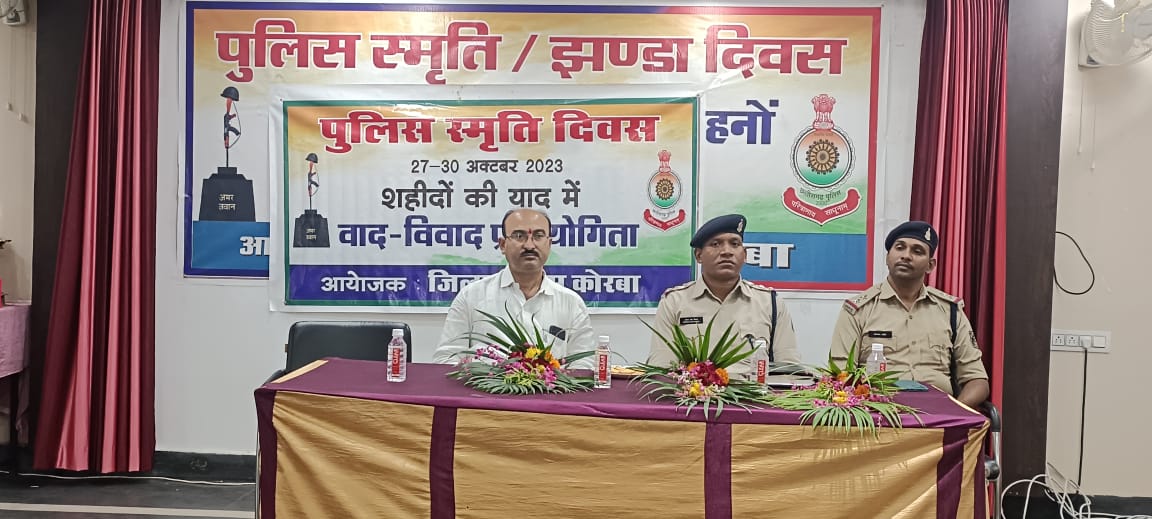 कोरबा में शहीदों की याद में "राष्ट्र के निर्माण में पुलिस की भूमिका" विषय पर वाद विवाद प्रतियोगिता का आयोजन किया गया तथा शस्त्र उपकरण युद्धक वाहनों की प्रदर्शनी लगायी गयी वाद विवाद प्रतियोगिता मे 13 प्रतिभागी भाग लिये एवं उपरोक्त विषय के आधार पर पुलिस के पक्ष एवं विपक्ष मे अपना अपना मत प्रस्तुत किये इस प्रतियोगिता मे प्रथम स्थान बरखा निशा सिंह द्वितीय स्थान वैशाली अग्रवाल तृतीय स्थान मियादान खान को प्रशस्ति पत्र,मेडल व उपहार दिया गया व भाग लेने वाले अन्य प्रतिभागी को प्रसास्ति पत्र, मेडल वितरित किया गया इस कार्यक्रम मे अग्रसेन कॉलेज के प्राचार्य डॉक्टर मनोज कुमार झा, निर्णायक गण डॉक्टर मोहम्मद वसीम अकरम, डॉक्टर शिवकुमार द्विवेदी, सुश्री अंजना चौधरी, प्राध्यापक गण डॉक्टर उषी बाला गुप्ता, श्रीमती किरण बाजपेई, डॉक्टर एस.के. कहार की उपस्थिति में