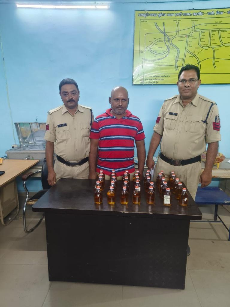 कोरबा। श्रीमान पुलिस अधीक्षक महोदय कोरबा श्री जितेन्द्र शुक्ला द्वारा आगामी विधानसभा चुनाव 2023 के मद्देनजर अवैध गतिविधियों पर प्रभावी कार्यवाही करने निर्देश दिए गए हैं जिस पर अतिरिक्त पुलिस अधीक्षक महोदय श्री अभिषेक वर्मा एवं नगर पुलिस अधीक्षक दर्री श्री रॉबिंसन गुड़िया के मार्गदर्शन में थाना प्रभारी हरदीबाजार नितिन उपाध्याय के नेतृत्व में हरदीबाजार स्टॉफ द्वारा लगातार कार्यवाही की जा रही है। आज दिनांक 21.10.2023 को मुखबीर सूचना मिली कि सराईसिंगार चौक गुड्डा ढाबा में अवैध रूप से शराब बिक्री करने की सूचना पर हरदीबाजार पुलिस द्वारा रेड कार्यवाही किया गया रेड के दौरान ढाबा संचालक आरोपी बबलू उर्फ बासुदेव जायसवाल पिता स्व. नर्मदा प्रसाद जायसवाल उम्र 48 वर्ष साकिन पुरानी बस्ती हरदीबाजार थाना हरदीबाजार जिला कोरबा द्वारा अपने ढाबा में अवैध रूप से बिक्री करने हेतु रखे अंग्रेजी गोवा शराब मिला, जिसके कब्जा से 35 पाव गोवा अंग्रेजी शराब प्रत्येक 180 एमएल वाली शीशी में भरा कुल 06 लीटर 300 एमएल शराब कीमती 4200 रूपये को जप्त कर अपराध क्रमांक 243/2023 धारा 34 (2) आबकारी अधिनियम कायम कर वैधानिक कार्यवाही कर गिरफ्तार पश्चात न्यायिक रिमांड पर भेजा गया है।