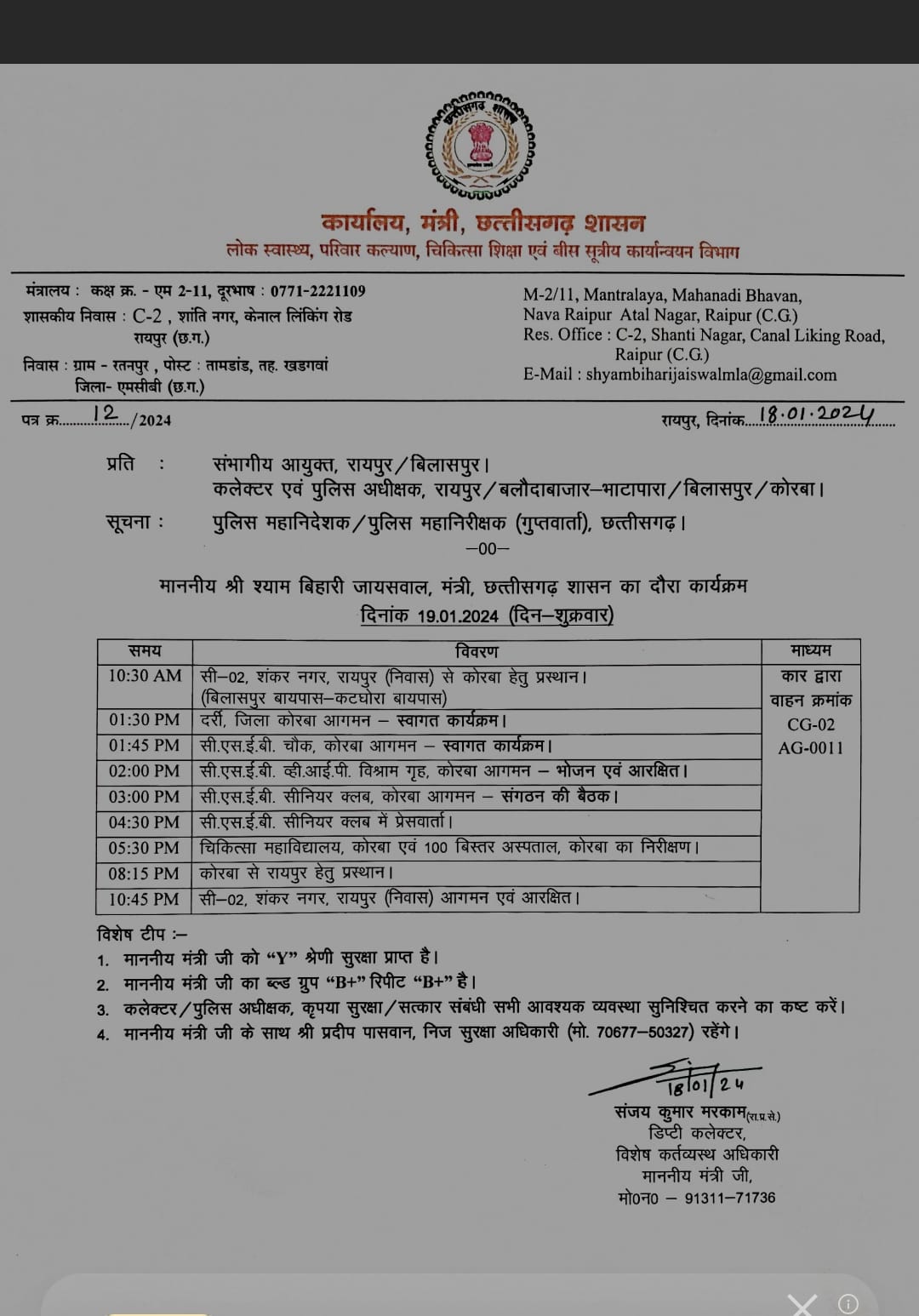 निर्धारित कार्यक्रम अनुसार मंत्री श्री जायसवाल का 19 जनवरी दोपहर 1:30 बजे कोरबा व 1:45 बजे सीएसईबी चौक आगमन होगा,