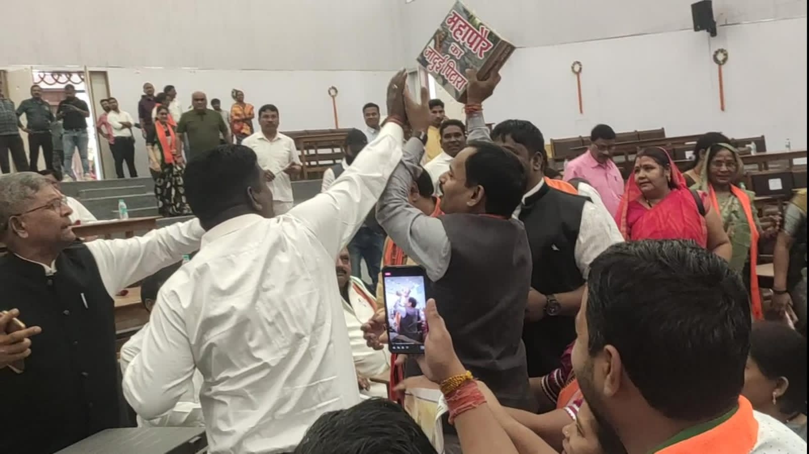 सामान्य सभा प्रारंभ होने के पूर्व भाजपा पार्षद दल ने उक्त सभागार के बाहर और अंदर परम पूज्य बाबा गुरु घासीदास सभागार का बैनर लगाया, अंदर के बैनर को निगम के कर्मचारियों द्वारा हटा दिया गया, जिसके बाद गहमागहमी का माहौल रहा |Tags :