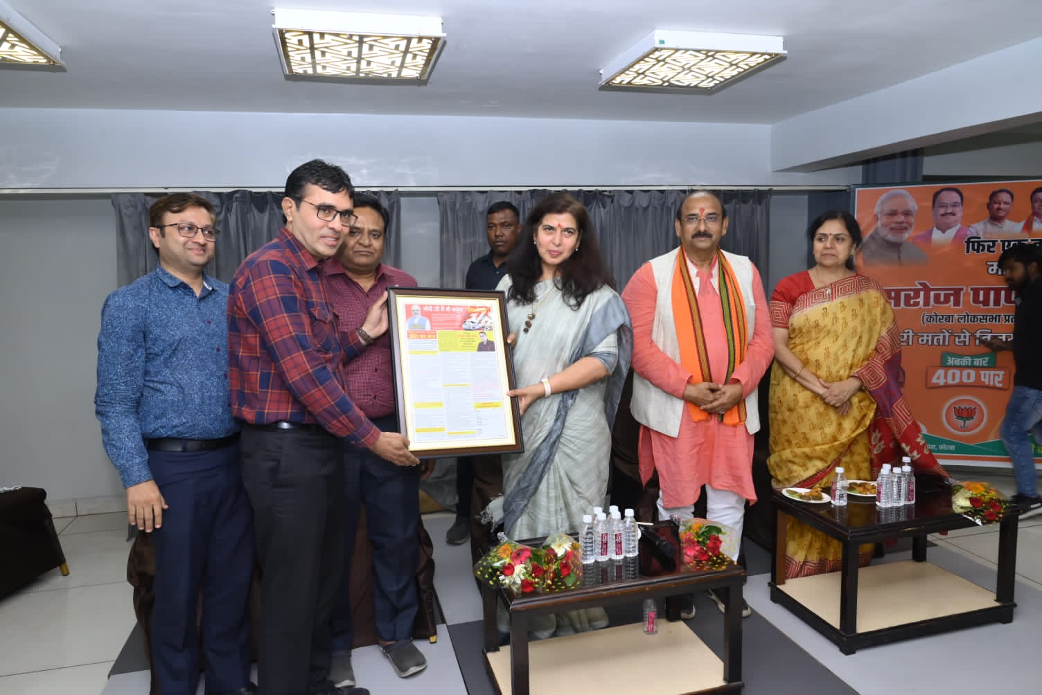 कोरबा (न्यूज उड़ान) शनिवार को कोरबा जिला अंतर्गत सीए एवं टैक्सबार एसोसिएशन की बैठक में भाजपा की राष्ट्रीय उपाध्यक्ष व लोकसभा सांसद प्रत्याशी डॉ सरोज पांडेय शामिल हुई।