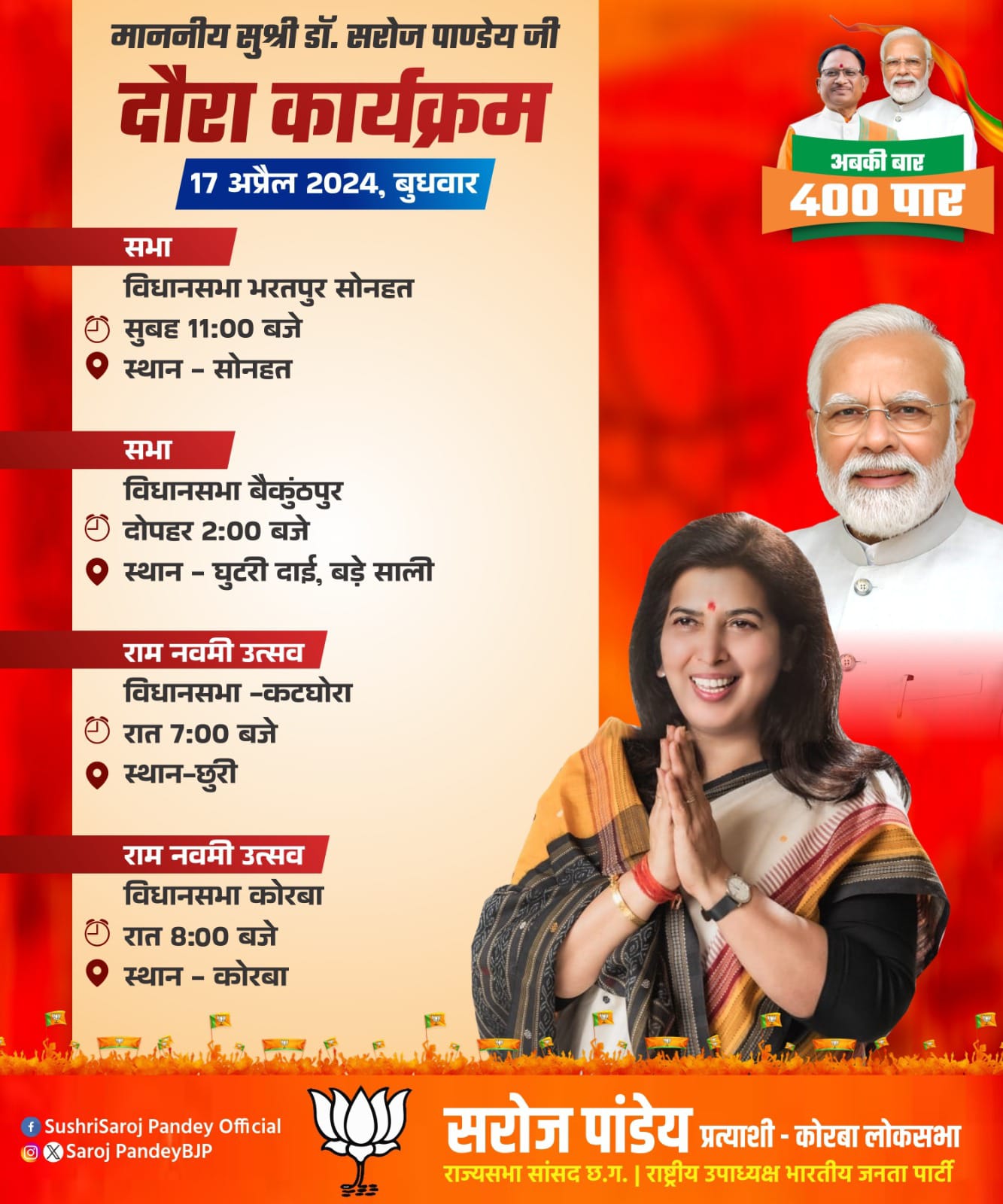 कोरबा( न्यूज उड़ान) लोकसभा क्षेत्र की भाजपा प्रत्याशी सरोज पांडेय ने आज 16 अप्रैल नवरात्र के अष्टमी पर भाजपा प्रत्याशी सरोज पांडेय ने निर्वाचन कार्यालय पहुंचकर अपना नामांकन दाखिल किया । नामांकन दाखिल करने के बाद मीडिया से चर्चा करते हुए उन्होंने कहा कि शक्ति और भक्ति का पर्व का जिसे हम सब इस पर्व को बड़े ही आस्था के साथ मनाते हैं। आज महाअष्टमी का पर्व है इस मौके पर अपना नामांकन दाखिल किया है, माता और जनता का आशीर्वाद मिलेगा, जनता के बीच विकास और भ्रष्टाचार के मुद्दे को लेकर जनता के बीच जाकर समर्थन मांगा जा रहा है, पिछले पांच वर्षों में यहां विकास शून्य और भ्रष्टाचार असीम बना रहा है।   https://youtu.be/HOk00890naE?si=9TEdxurxFf9wg9Ji   उन्होंने बताया कि 18 अप्रैल को प्रदेश के मुख्यमंत्री विष्णुदेव साय की उपस्थिति में वरिष्ठ नेताओं के साथ पुनः नामांकन दाखिल किया जाएगा । इस मौके पर केबिनेट मंत्री लखन लाल देवांगन, भाजपा जिलाध्यक्ष डॉ राजीव सिंह, आरिफ खान समेत भाजपा के अन्य पदाधिकारी मौजूद रहे ।