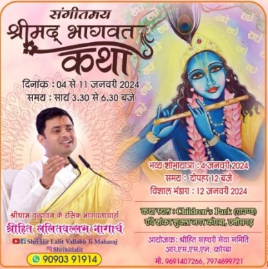 4 जनवरी से कथा शुरू होगी। समिति की संरक्षक नीरू राय ने बताया कि भागवत कथा की शुरुआत भव्य शोभायात्रा के साथ होगी। समापन अवसर पर विशाल भंडारा किया जाएगा।