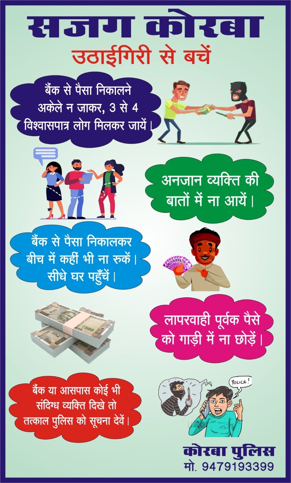 थाना/चौकी प्रभारीगण उनके थाना क्षेत्र अंतर्गत संचालित बैंकों की सुरक्षा व्यवस्था जिसमें बैंक में लगे सुरक्षा अलार्म सिस्टम, सीसीटीवी, सुरक्षागार्ड की जांच, बैंक परिसर में संदिग्ध व्यक्तियों की चेकिंग, बैंक के ग्राहक को बैंक में पैसा निकालकर बीच में कहीं भी ना रुके सीधे घर पहुंचे, लापरवाही पूर्वक पैसे को गाड़ी में ना छोड़े, बैंक या आसपास कोई भी संदिग्ध व्यक्ति दिखे तो तत्काल पुलिस को सूचित करें, बैंक में आए लोगों को वित्तीय फ्रॉड की जानकारी देना शामिल है।