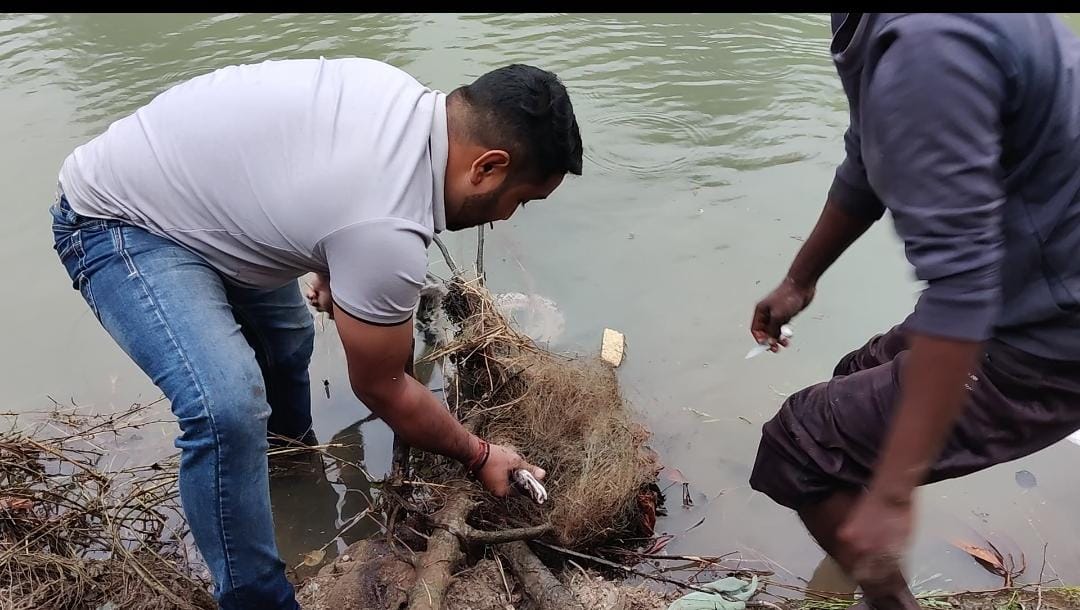 जिसके बाद दोनों नहर के बीचों बीच काटे से भरे झुंझ को पार किया, आखिरकार जिस जगह अजगर फसा हुआ था वहा पहुंचने में सफलता मिली पर वहा घाट न होने और सीधी चढ़ाई होने के कारण दिक्कत होने लगी पर कहते हैं न हौसला अगर मजबूत हो तो किसी भी परेशानी को पार किया जा सकता हैं, फिर बड़ी सावधानी से वहा तक पहुंचे और लकड़ी को हटाया गया और पानी के अन्दर लगे मछली जाल को निकाला गया।