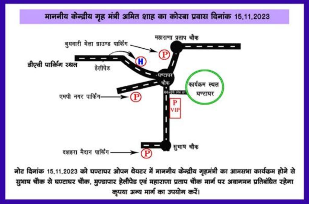 दिनांक 15.11.2023 को घंटाघर ओपन थिएटर में माननीय केंद्रीय गृह मंत्री का आम सभा कार्यक्रम होने से सुभाष चौक से घण्टाघर चौक, मुण्डापार हेलीपैड एवं महाराणा प्रताप चौक मार्ग पर आवागमन प्रतिबंधित रहेगा कृपया अन्य मार्ग का उपयोग करें।Tags :