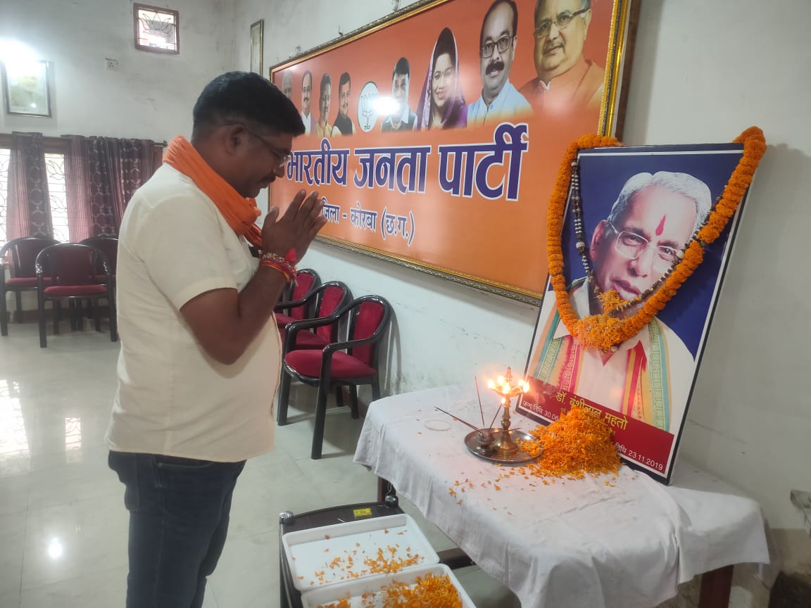 भारतीय जनता पार्टी कार्यालय कोरबा में आज पूर्व सांसद स्वर्गीय डॉक्टर बंसीलाल महतो की चतुर्थ पुण्यतिथि मनाई गई । इस अवसर पर उपस्थित कार्यकर्ताओं ने उन्हें श्रद्धा सुमन अर्पित किए एवं उनके साथ बिताए गए अपने अनुभवों को स्मरण किया ।