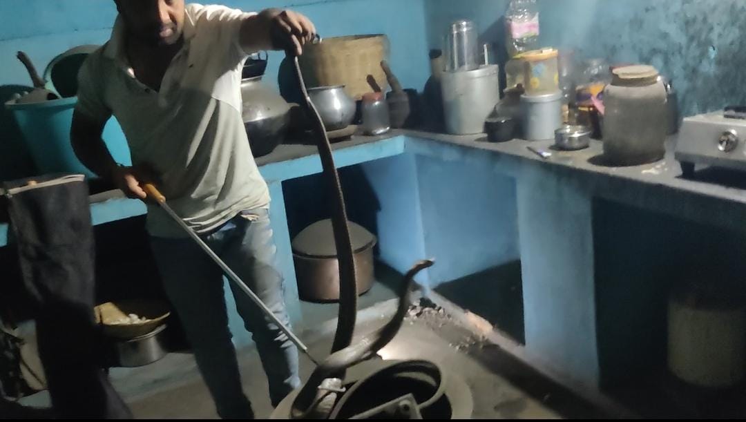 : <em>प्यास लगी तो रात 2 बजे खोला फ्रीज,निचे ही बैठा था गुसैल कोबरा, बोला मौत के मुंह से वापस आया, वन विभाग के रेस्क्यू टीम ने किया रेस्क्यू।</em>