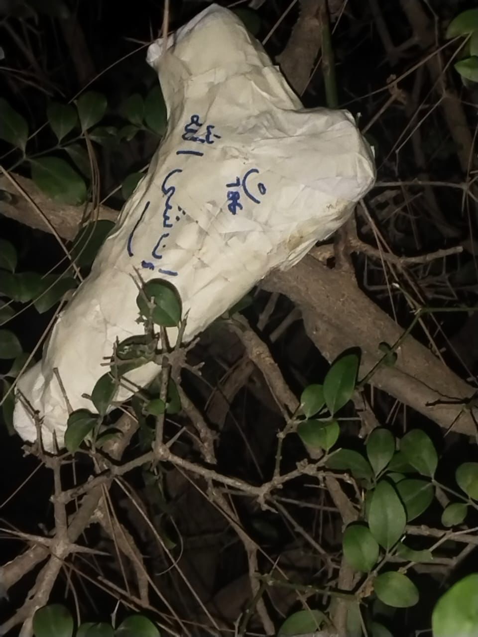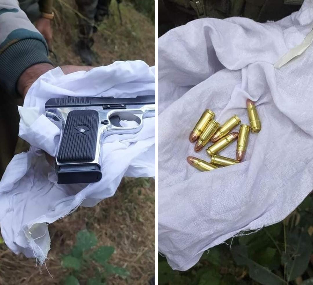 तलाशी के दौरान सफेद कपड़े में लिपटी एक पिस्तौल, 9 एमएम पिस्तौल के 8 कारतूस और अन्य आपत्तिजनक सामग्री बरामद की गई। सफेद कपड़े पर ब्लेक मार्कर के साथ 786 चांद तारा चिन्ह बनाया हुआ था।